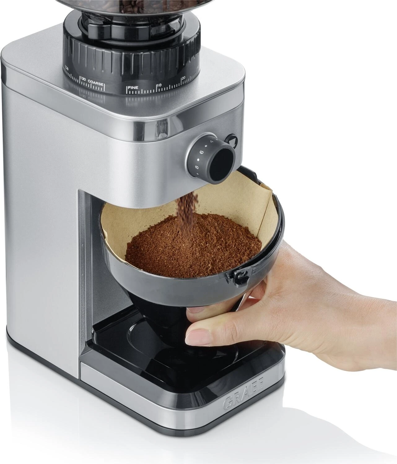 Die Kaffeemühle CM 500 von GRAEF besitzt ein Edelstahl-Kegelmahlwerk. Das Kegelmahlwerk hat den Vorteil, durch geringe Drehzahlen keine oder wenig Hitze zu erzeugen, dadurch ist das Mahlen aromaschonender. Der auf 140 Stufen einstellbare Mahlgrad bildet die Grundlage für den individuellen Kaffeegenuss. Es kann direkt in den Siebträger, den Kaffeefilter oder den Kaffeemehlbehälter gemahlen werden. Dank der ’Grind on Demand’-Funktion, also die automatischen Mahlfunktion für Siebträger, stimmen Sie die Kaffeemehlmenge ganz individuell auf Ihre Bedürfnisse ab. Sie halten den Siebträger einfach so lange an den Kontaktschalter bis er voll ist. Es gibt nichts über frisch gemahlene Kaffeebohnen mit vollstem Aroma.
