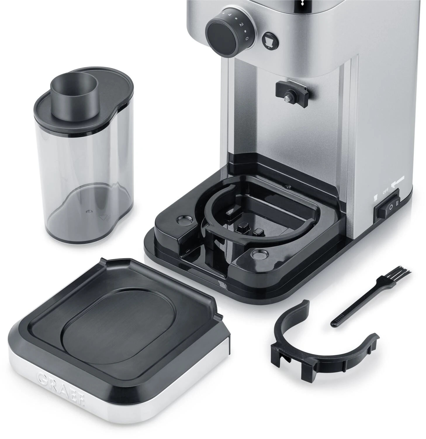 - Lieferumfang: Siebträgerhalter groß und klein, Kaffeemehlbehälter, Fülltrichter, Reinigungsbürste