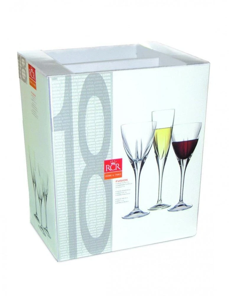RCR Gläser-Set Fusion, 18-teilig. Das Set besteht aus sechs Rotwein-, sechs Weißwein- und sechs Sektgläsern. Die italienischen Kristallgläser sind ein optisches Highlight und von beeindruckender Qualität.
