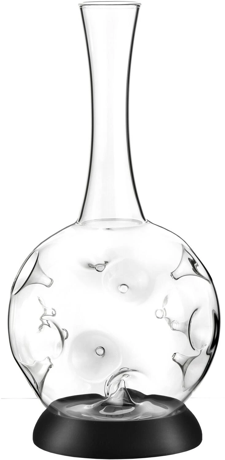 Das Volumen dieses Beatmungsgeräts wurde so dimensioniert, dass bei einer Befüllung von bis zu 1,5 Litern eine möglichst große Oberfläche des Weines entsteht. Der Dekanter steht aufgrund des abgeflachten Bodens sicher und gerade, die Basis aus mattschwarzem Silikon ermöglicht zudem auch eine schräge Positionierung.