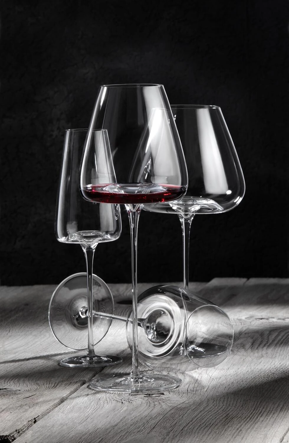 Diese nach innen gerichteten Verwirbelungskörper erzeugen im Zusammenspiel mit Licht und dem enthaltenen Wein interessante Farbspiegelungen und formale, fast graphische Effekte.